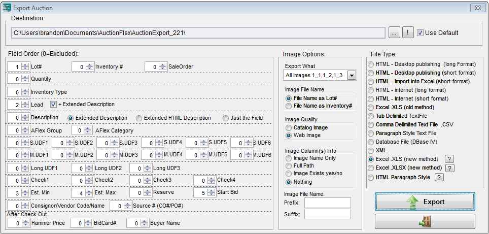 Once you've built your catalog, you need an easy way to export it. Auction Flex gives you a very powerful Auction Export form that gives you complete control over what fields to export, what images to export, how to have the image filenames named, and what file type to create.