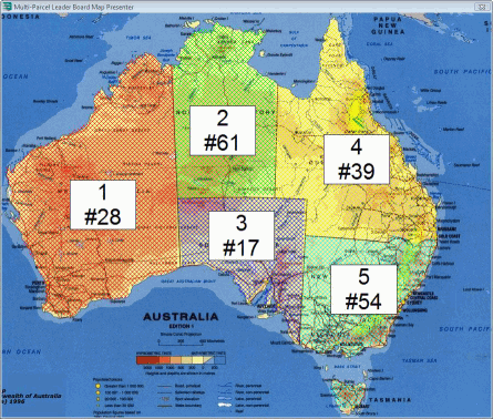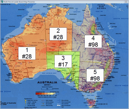 Computers can support multiple monitors/projectors showing different screens. A popular setup for our customers is to use one projector for the grid presenter and a separate projector for the map presenter. In a smaller auction (like the one pictured here with only 5 parcels) it is possible to show both the grid presenter and the map presenter using a single projector.